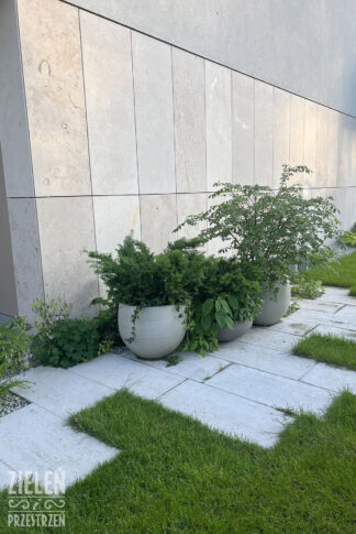 Ograniczenia techniczne związane z systemem drenażowym wykluczyły możliwość tradycyjnych nasadzeń w gruncie. W odpowiedzi na to wyzwanie, stworzyliśmy kompozycję opartą na systemie donic. W starannie dobranych, wielkogabarytowych pojemnikach umieściliśmy różnorodne rośliny ozdobne, co pozwoliło na wprowadzenie bogatej roślinności bez ryzyka uszkodzenia instalacji drenażowej.