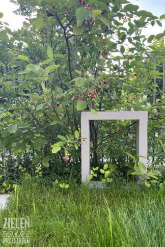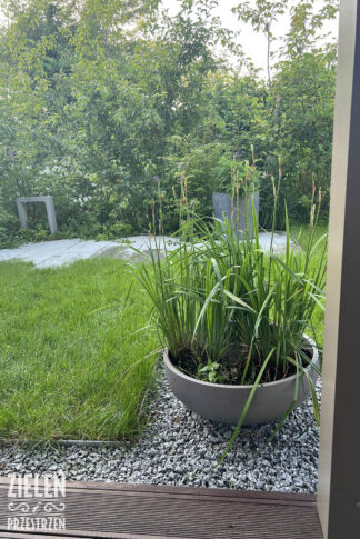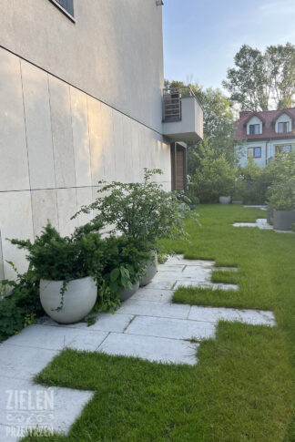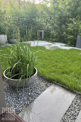 Nawierzchnię ogrodu urozmaiciliśmy dynamicznym układem płyt z betonu architektonicznego, przełamując monotonię trawnika i tworząc interesujące połączenie form geometrycznych. Całość kompozycji utrzymana jest w stonowanej palecie kolorystycznej, gdzie dominują delikatne odcienie brązu i szarości, harmonijnie współgrające z architekturą osiedla.