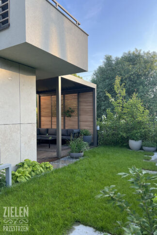 Dominantą projektu jest elegancki taras wykonany z naturalnego drewna, wyposażony w zaawansowane zadaszenie sterowane pilotem, chroniące przed deszczem i słońcem. Przestrzeń tarasu została wzbogacona o ażurowe ścianki przesuwne, które nie tylko zapewniają prywatność od strony ulicy, ale również stanowią atrakcyjny element dekoracyjny.